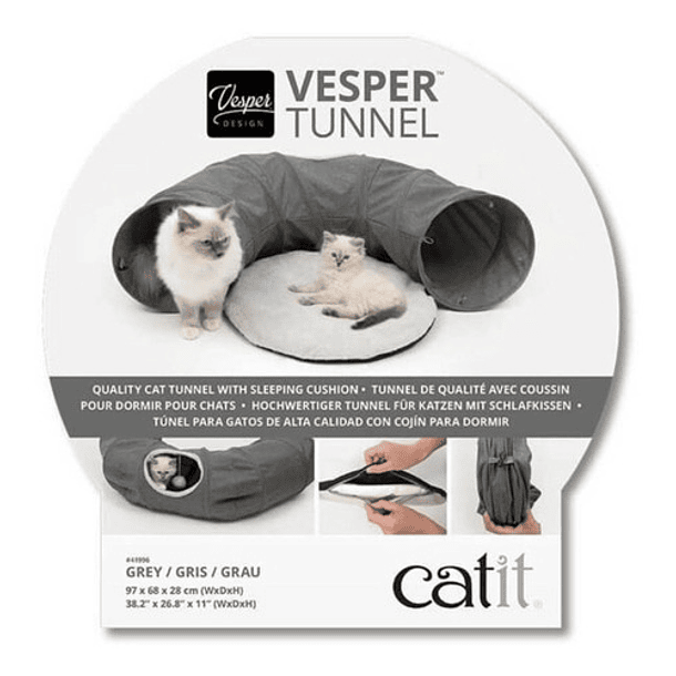 Con el Vesper Túnel para gatos de Catit está disponible en dos colores: gris y azul marino. tu gato tendrá innumerables horas de diversión mientras juega y explora. Además el túnel viene con una cama redonda suave, para que haga sus siestas merecidas después de jugar. El tejido es resistente a las rasgaduras, está hecho con tela de alta calidad lo que evita los enganches de las uñas de los gatos, incluso resistirá los juegos de los gatitos más traviesos. Dimensiones Largo del túnel: 96cm Ancho del túnel: 48cm Alto del túnel: 28cm Ancho de la abertura lateral: 23,5cm Diámetro de la cama: 40cm