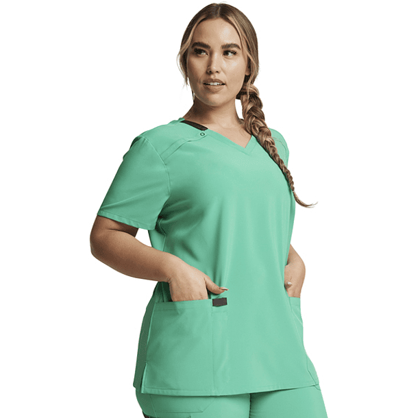 Una camiseta de corte contemporáneo con cuello en V, dos bolsillos de parche y ranura para bolígrafo. También incluye una etiqueta tejida tonal característica de la marca, una cinta de sarga de utilidad y una cinta de sarga con el logotipo de la marca en el cuello. Longitud en el centro de la espalda: 26".